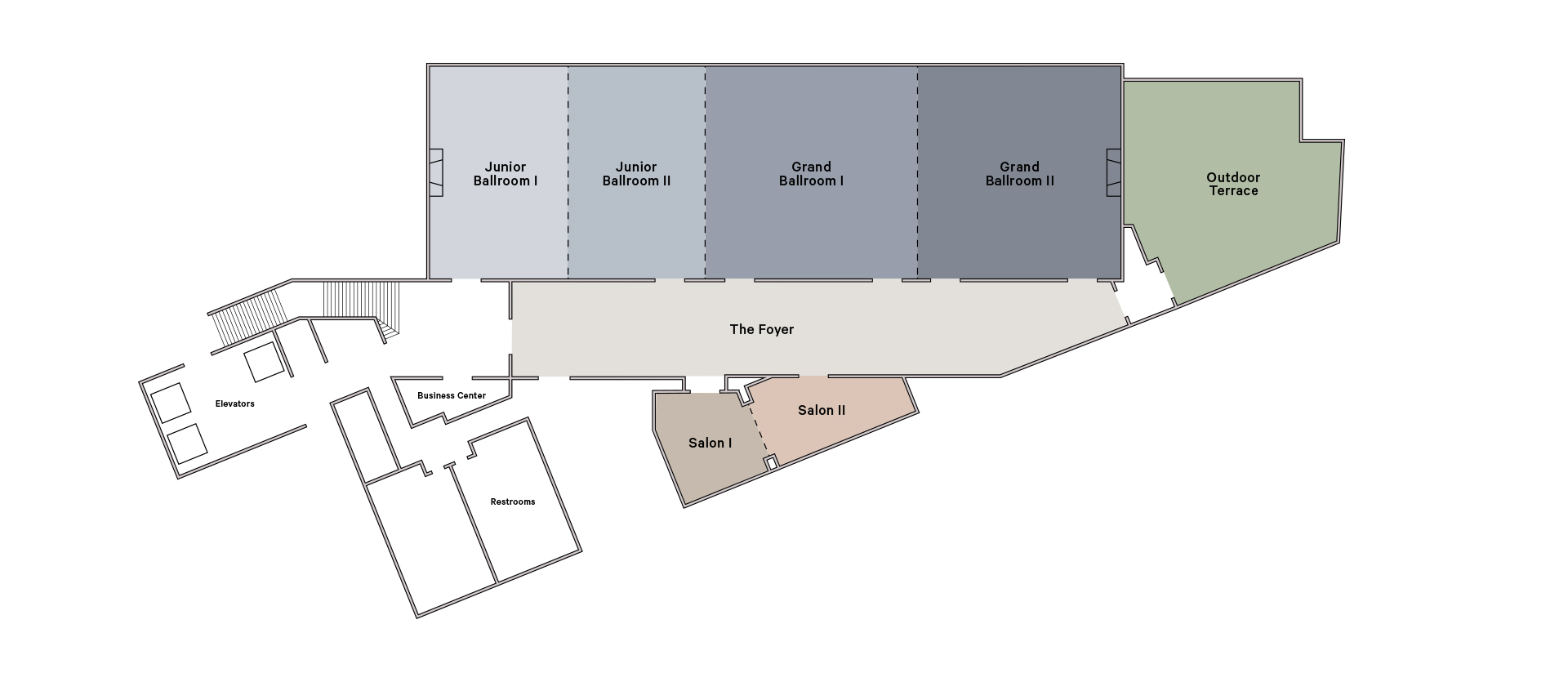 | JUNIOR BALLROOM | Virtual Tour | 2,230 | 53 x 42 | 14 | 180 | 150 | 130 | 90 | 60 | 48 | 60 | 78 |